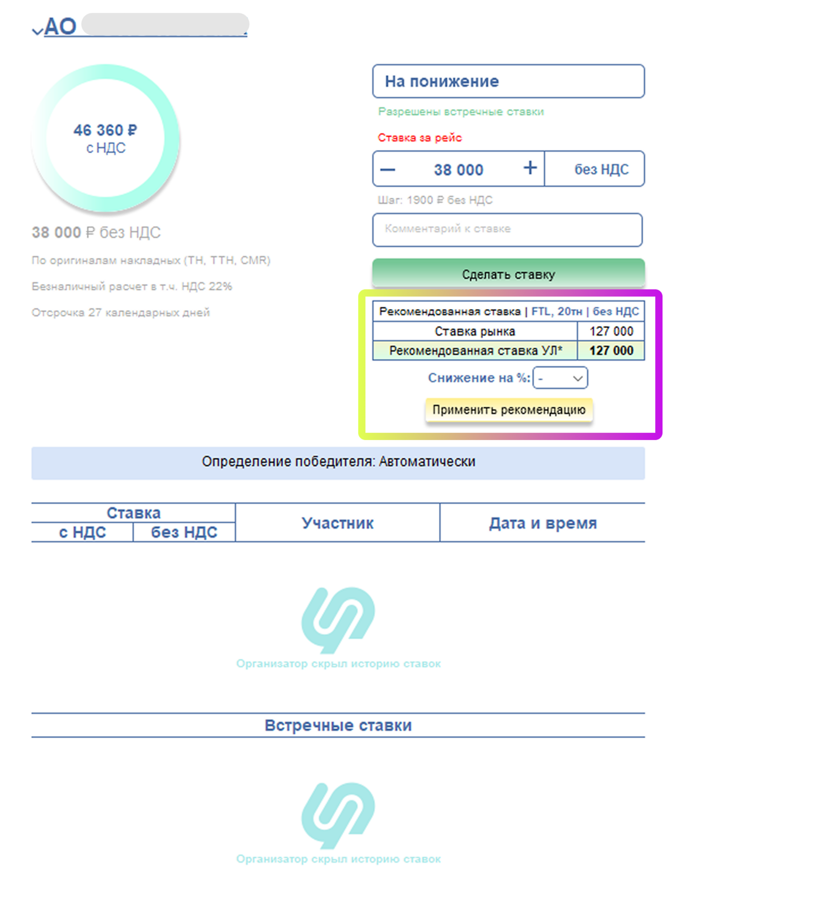 Получайте актуальную ставку по конкретным данным: маршруту, дате, типу ТС, радиусу. Вместо статичного отчета с данными по нескольким направлениям — динамичный отчет с одной цифрой по вашим критериям. | | | | Рекомендации ставок во входящих аукционах | | | Продукт: Транс для транспортных компанийЧто сделали? Теперь во входящем аукционе в Умной Логистике Транс пользователь видит рекомендованную ставку, рассчитанную на основе Big Data в Умной Логистике.Рекомендация ставки строится по:- конкретному направлению;