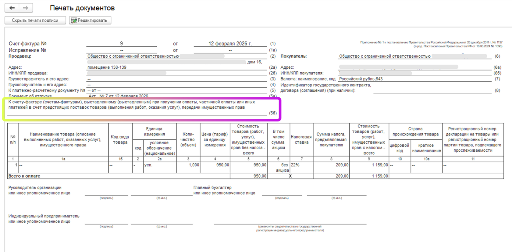 - В счете-фактуре появилось новое поле 5б — для отражения информации по авансовым счетам-фактурам. Поле уже добавлено и в передачу по ЭДО.