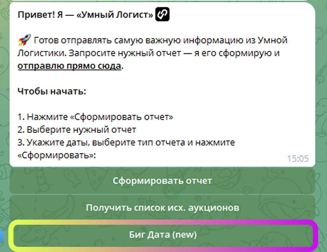 В боте выберите команду «Биг Дата new» и отчет по направлению. | | | | Укажите направление — при вводе первых трех букв названия города бот предложит список подходящих наименований. Кроме города, можно указать радиус и тип кузова. По умолчанию установлены значения «радиус — 50 км» и «Тип Т С — тент». | | | | Нажмите «Сформировать» — вы получите ставку на сегодняшний день и за прошлый месяц, если есть данные. Данные обновляются каждый день. | | | | Зачем сделали?
