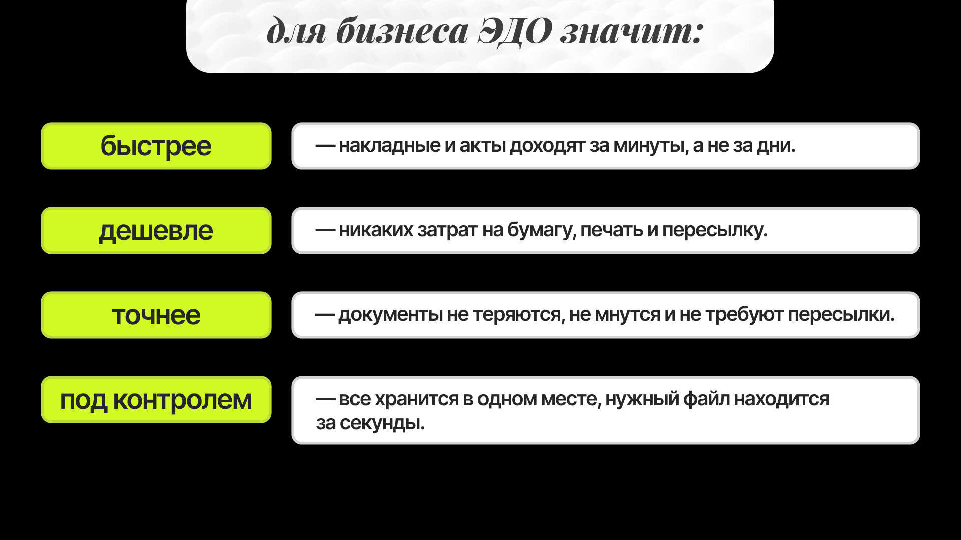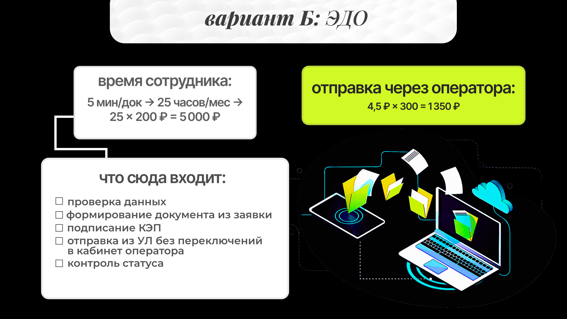 ЭДО — электронный документооборот. Партнеры обмениваются важными файлами вроде актов и заявок в цифровом виде с электронной подписью. В логистике ЭДО постепенно становится обязательным — по инициативе государства. Есть даже специальный термин для электронных документов в этой сфере — ЭПД. Туда входят накладные, заказ-заявки, путевые листы и не только. Мы посчитали, выгодно ли переводить бизнес в ЭДО.