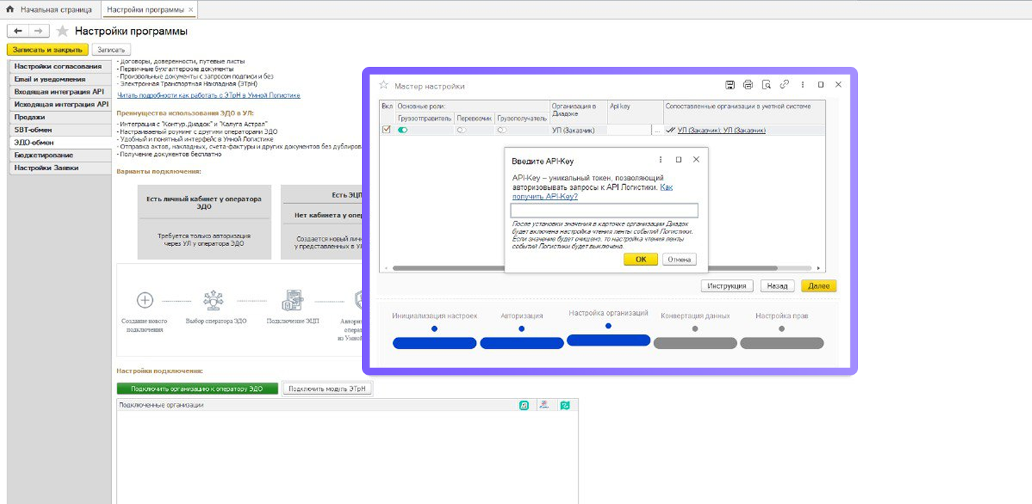1. Зарегистрироваться или авторизоваться в Контур. Диадок Логистика. | | | | 2. Получить API-ключ, чтобы связать кабинеты Диадока и Умной Логистики. | | | | 3. Выбрать организации, от лица которых будете создавать и отправлять ЭТрН, и роли в них, чтобы правильно заполнять титулы.