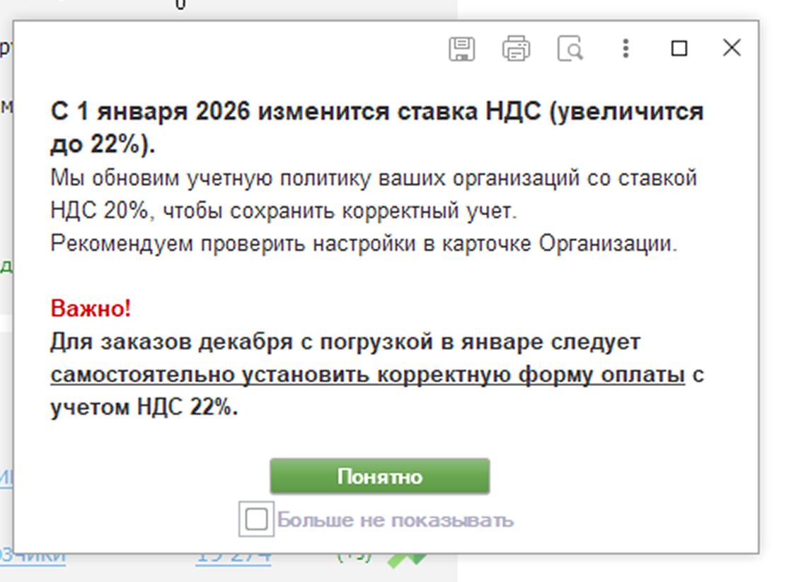 С января 2026 года НДС станет 22%, поэтому подготовили обновление учетной политики организаций в части этого налога — с 1 января автоматически добавится ставка 22%. Так что в новом году можно будет сразу работать по закону: делать ставки в аукционах, получать заказы и отправлять заявки — с НДС 22%. | | | В этих документах расширили список значений для поля «Ставка НДС»:- форма оплаты;