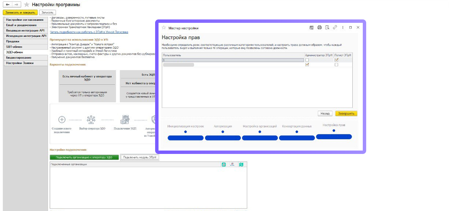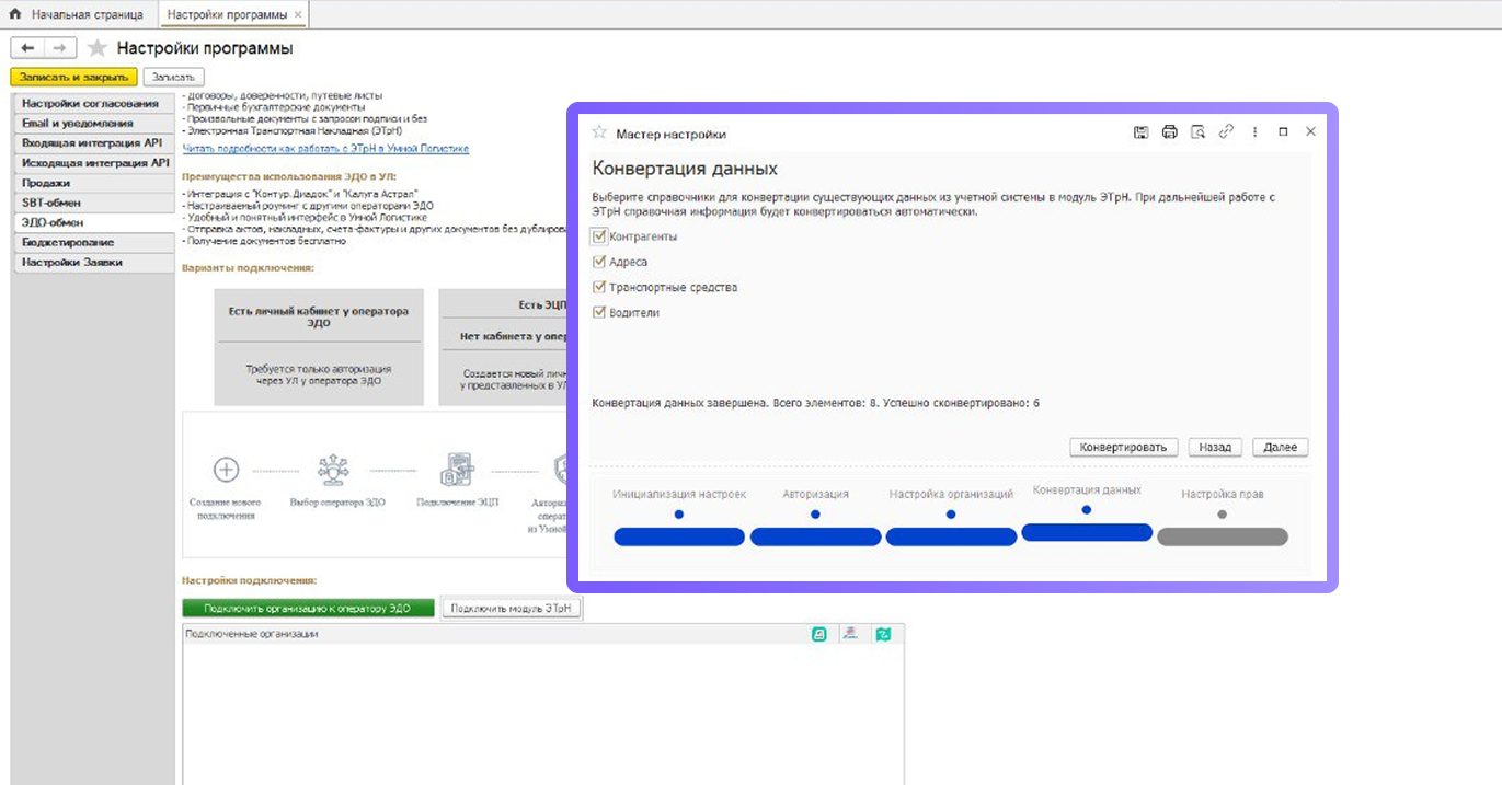 4. Выбрать титулы: четыре обязательных и четыре опциональных, которые помогают оформлять переадресацию, фиксировать стоимость перевозки и не только. | | | | 5. Конвертировать справочники, чтобы данные в вашем аккаунте Умной Логистики синхронизировались с данными в Диадоке. | | | | 6. Настроить права пользователей: кто и как может работать с ЭТрН. | | | Когда все настроили, можно создавать ЭТрН:- из заявки;