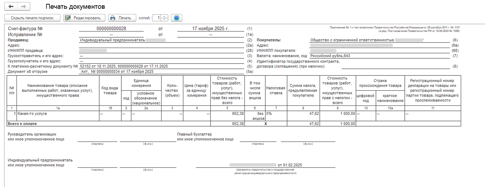 С 1 января 2026 года поменяется оформление счета-фактуры для ИП. Вместо данных свидетельства о государственной регистрации нужно будет указывать основной государственный регистрационный номер и дату его присвоения.