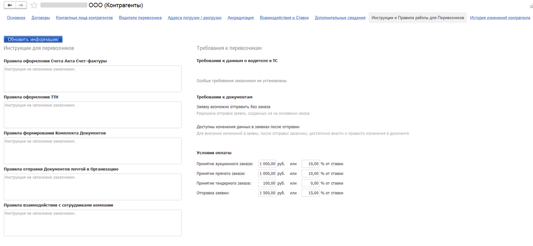 - Обновили блок контрагента в Транс «Инструкции и правила работы для перевозчиков» — теперь всегда отображаем стоимость заказов и заявок, даже если они базовые или нулевые.