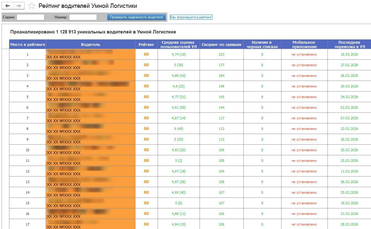 | | | | Умная Логистика не просто обрабатывает данные, а дает рекомендации на основе анализа | | | | Такой формат помогает не тратить время на сбор информации по разным источникам. Можно сразу принять решение на основе полной картины по водителю. Если нужно, распечатайте или отправьте по почте файл со скорингом. Ничего не нужно собирать вручную или копировать — все делается в системе за два клика. | | | | Как быстро выбрать надежного исполнителя | | | | Если на рейс нужно срочно подобрать нового водителя, используйте рейтинг водителей. По умолчанию система показывает ТОП-30 — список лучших водителей по истории реальных перевозок в экосистеме. | | | | Максимальный рейтинг — 100. Число складывается из баллов по отдельным показателям. Расшифровку можно посмотреть в Умной Логистике | | | Рейтинг учитывает: - оценки пользователей после завершенных перевозок → помогает понять, насколько стабильно водитель завершает рейсы без проблем;