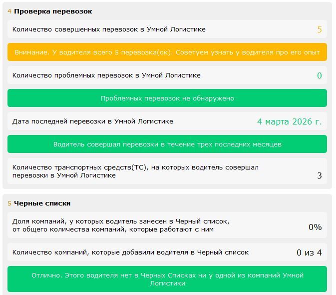 2. Сверить ФИО и данные в разных источниках: например, на других площадках и биржах. 3. Обратить внимание на совпадение данных водителя, номера телефона и автомобиля. 4. Дополнительно проверить водителя по открытым реестрам и поиску. При такой проверке данные приходится искать в разных местах, собирать информацию по частям и сверять все вручную. Это занимает время, требует внимательности и все равно не дает полной уверенности в результате — слишком легко пропустить деталь или довериться неполным данным. Еще один вариант — проверить водителя через отраслевое комьюнити. Можно спросить у коллег в чате, работал ли кто-то с этим исполнителем, были ли проблемы. Но и это не гарантия, что водитель в итоге не окажется мошенником. На самом деле процесс проверки можно автоматизировать, сохранив уровень безопасности. | | | | Как проверить водителя за минуту без горы сервисов | | | Автоматизированные системы заметно ускоряют и упрощают проверку — все уже собрано в одном месте. Например, в Умной Логистике на это уходит меньше минуты: достаточно выбрать нужного водителя, и система сразу покажет досье с расшифровкой. В скоринге водителя видно: - со сколькими компаниями он уже работает;