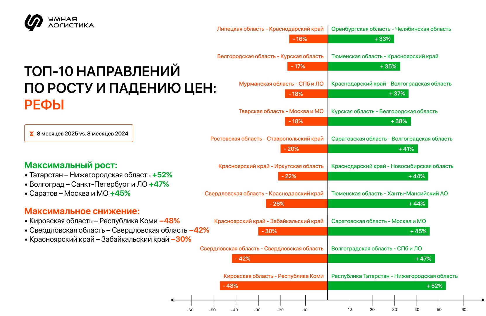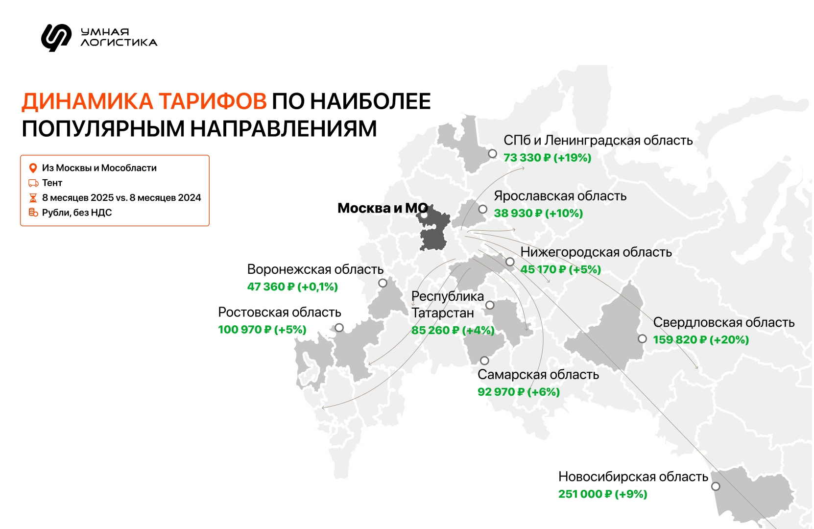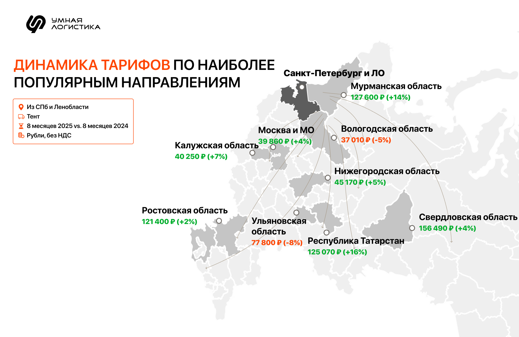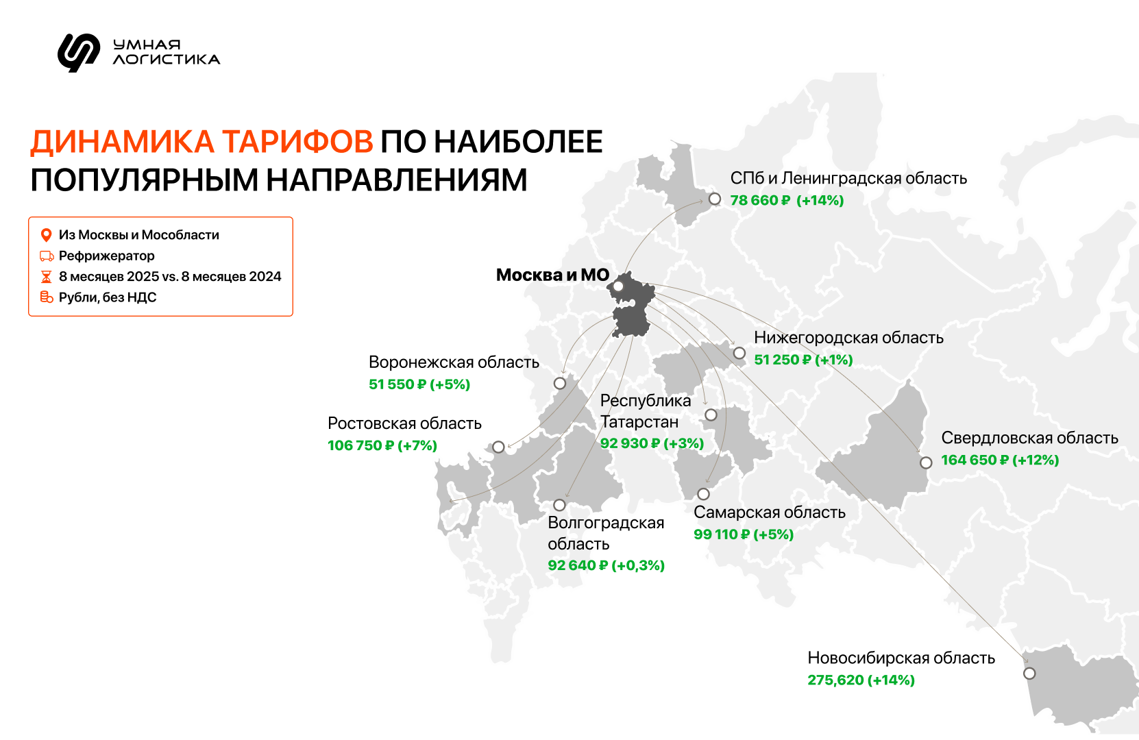 Сейчас рынок тентованных и рефрижераторных перевозок постепенно выравнивается: в большинстве регионов избыток или нехватка машин снижаются, а соотношение заявок «в регион» и «из региона» приближается к единице. Это значит, что спрос и предложение начинают совпадать, рынок становится сбалансированнее, и тарифы стабилизируются. | | | | ТОП-10 направлений по росту и падению тарифов | | | | Изменения спроса и предложения на рынке грузоперевозок отразились на тарифах. | | | | В сегменте перевозок тентами тарифы выросли на ряде магистральных направлений, но снизились на ближних и локальных перевозках. | | | | В сегменте рефрижераторных перевозок рост тарифов заметен в крупных межрегиональных маршрутах, а падения — в локальных и смежных. | | | | Как узнать, что будет с тарифами на перевозки в ближайшее время | | | | Анализировать и строить прогнозы тарифов удобнее с реальными цифрами рынка. В этом помогают большие данные, в частности, инструмент «Расчет ставки по Big Data» в Умной Логистике.