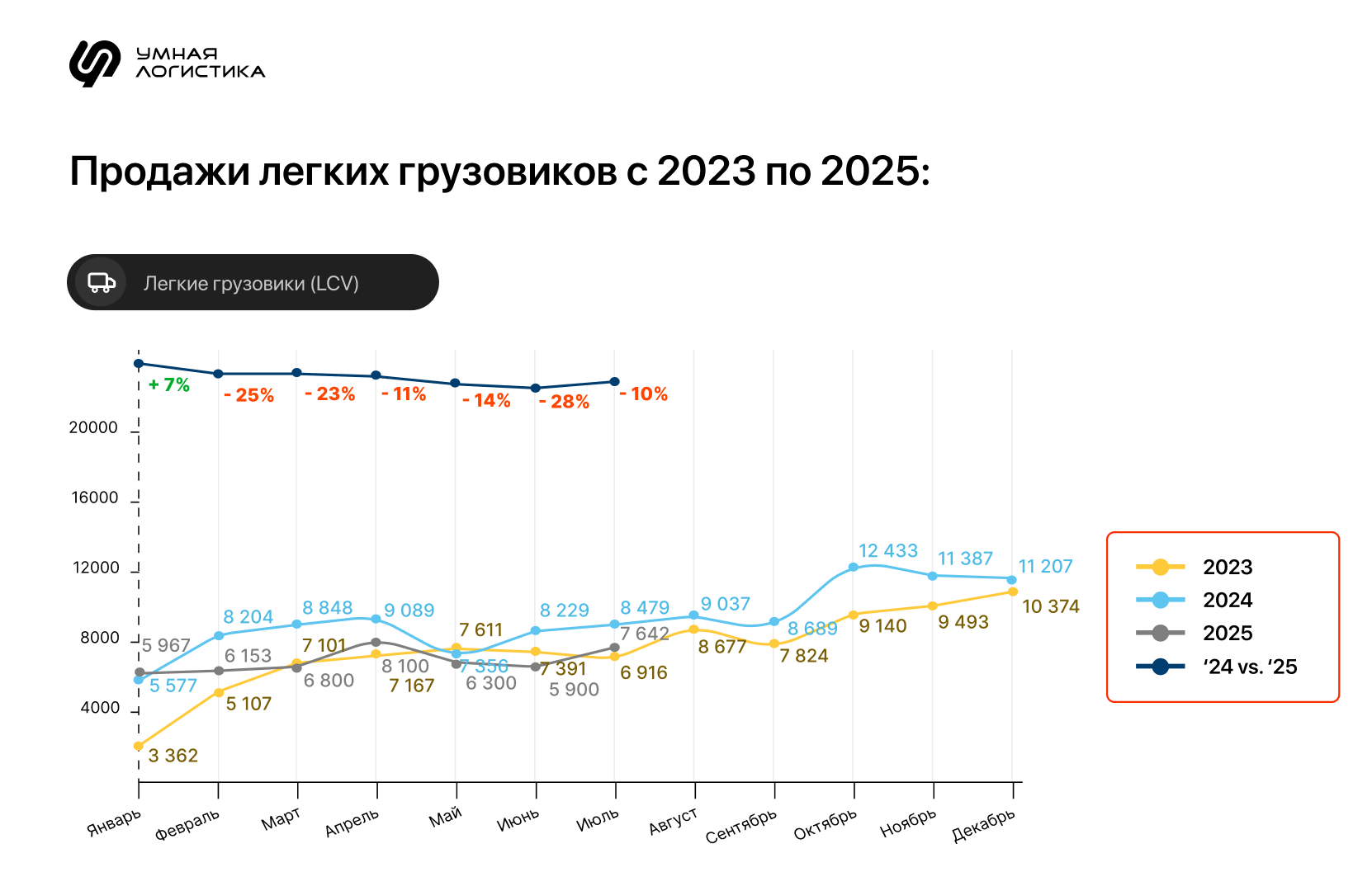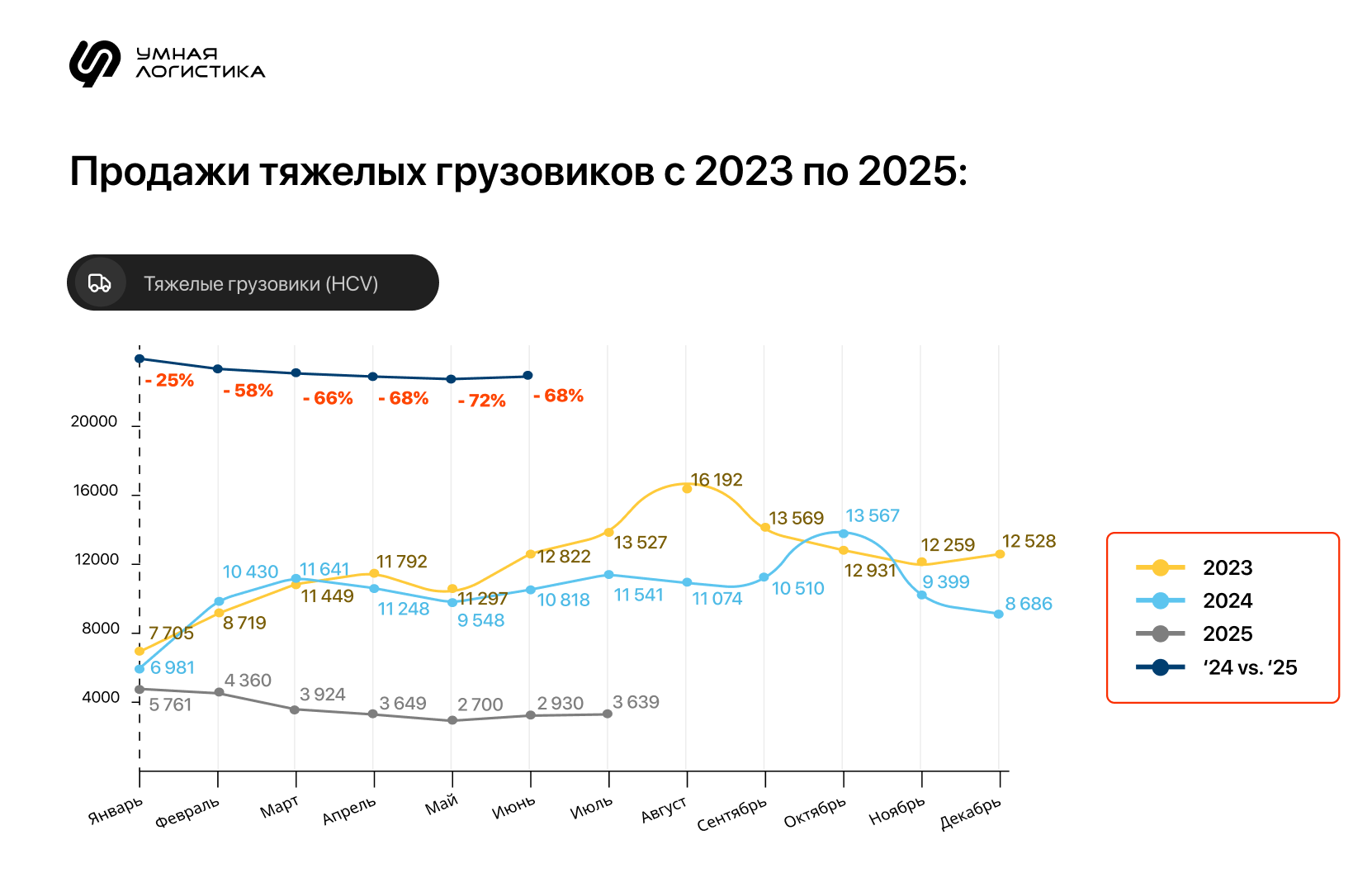 В 2023—2024 годах на снижение тарифов повлияли несколько факторов. | | | | Компании массово закупили транспорт | | | С 2022 по 2024 год парк тягачей увеличился с 618 тысяч до 707. Транспортные компании закупали ТС в преддверии удорожания лизинга и повышения ключевой ставки ЦБ. Пик закупок пришелся на 2023−2024 годы — тогда лизинг оставался доступным, а утильсбор не давил на цены техники.Итог: рост предложения на рынке грузоперевозок, ведь свободных машин стало больше. | | | | Увеличилась финансовая нагрузка на перевозчиков | | | В октябре 2024 года ЦБ повысил ключевую ставку до 21% — лизинг подорожал. Тогда же Правительство Р Ф утвердило план пошаговой индексации утильсбора — платежи должны были вырасти на 70−80% и увеличиваться каждый год на 10−20%. Чтобы обслуживать долги, перевозчики решили сокращать расходы. Итог: транспортные компании соглашались на меньшие тарифы и перестали закупать новые тягачи — выгоднее использовать старые по максимуму. | | | | Объемы перевозок упали из-за стагнации в отраслях грузовладельцев | | | Из-за повышенной ставки ЦБ сократились объемы производства у грузовладельцев — строить дома, производить металл стало дороже. Так что объем спроса на перевозки просел. Заказов на перевозку стройматериалов и металлов стало меньше на 10–30% по сравнению с аналогичным периодом в 2023. Главная задача перевозчиков — привлечь грузовладельцев даже при низком спросе, чтобы загрузить автопарк. Итог: транспортные компании начали демпинговать цены — тарифы снизились. | | | | Что происходит с тарифами на грузоперевозки в 2025 году | | | | Первый квартал: тарифы продолжают падать | | | | Причина — соотношение спроса и предложения на рынке перевозок. Предложение в начале года оставалось высоким из-за большого количества свободных машин. Но крупные ритейлеры начали активно развивать и использовать свой автопарк — спрос на перевозки снизился. | | | | Второй квартал: падение и повышение тарифов | | | На изменение в тарифах повлияли несколько факторов. 1. Дисбаланс на рынке тяжелого и легкого грузового транспорта давил на тарифыРынок грузовых автомобилей начал охлаждаться. Объем продаж упал в два раза по сравнению с тем же периодом прошлого года. Тенденция сохраняется из-за высоких ставок по лизингу, из-за него же все больше машин возвращают обратно лизинговым компаниям. | | | 2. Вырос спрос на легкий коммерческий транспорт Потребности заказчиков перетекли на рынок легкого коммерческого транспорта благодаря развитию e-commerce. Растут объемы доставки на «последней миле» — от складов до магазинов, пунктов выдачи и покупателей. | | | 3. Часть перевозчиков ушли с рынка из-за дорогого лизинга, который давит на рентабельность. Как это отразилось на рынке: - Возвраты автомобилей по лизингу достигли пика.