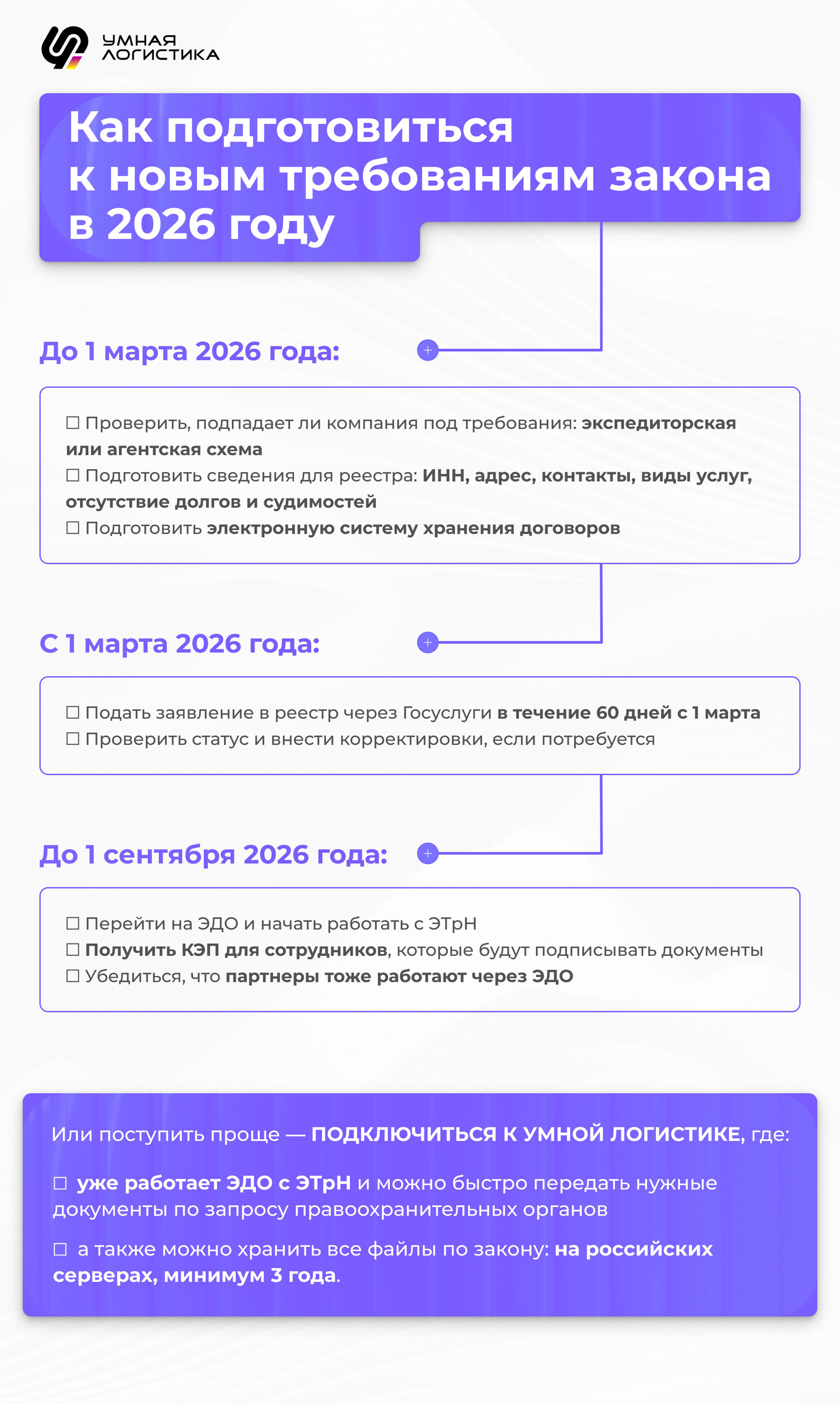 | С 1 сентября вступает в силу закон об усилении контроля за грузоперевозками. В 2026 году экспедиторам нужно будет регистрироваться в реестре, хранить документы по новым правилам и использовать электронную транспортную накладную (ЭТрН). Читайте гайд, чтобы подготовить компанию к новым правилам игры всего за 5 шагов. | | | | Что изменится в законах в 2026 | | | - С 1 марта 2026 года: реестр экспедиторов + новые правила хранения документов.