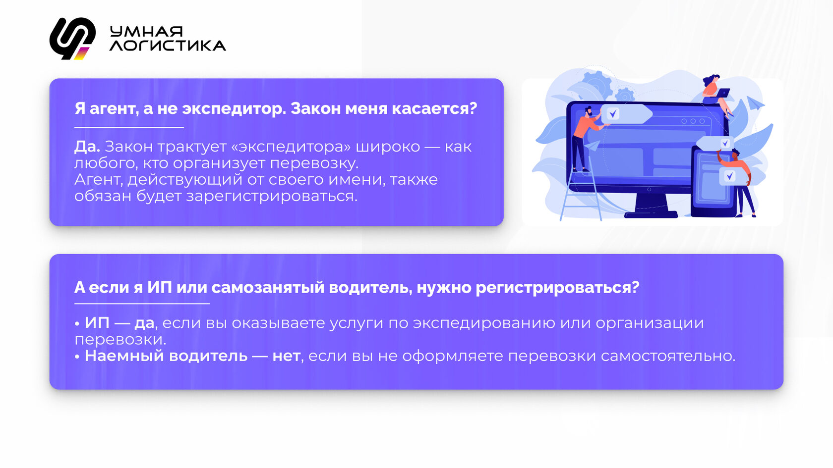 | | | | Шаг 1. Проверьте, попадает ли ваша компания под закон о реестре экспедиторов | | | | Вас коснется закон, если: | | | - Работаете по агентской или экспедиторской схеме.