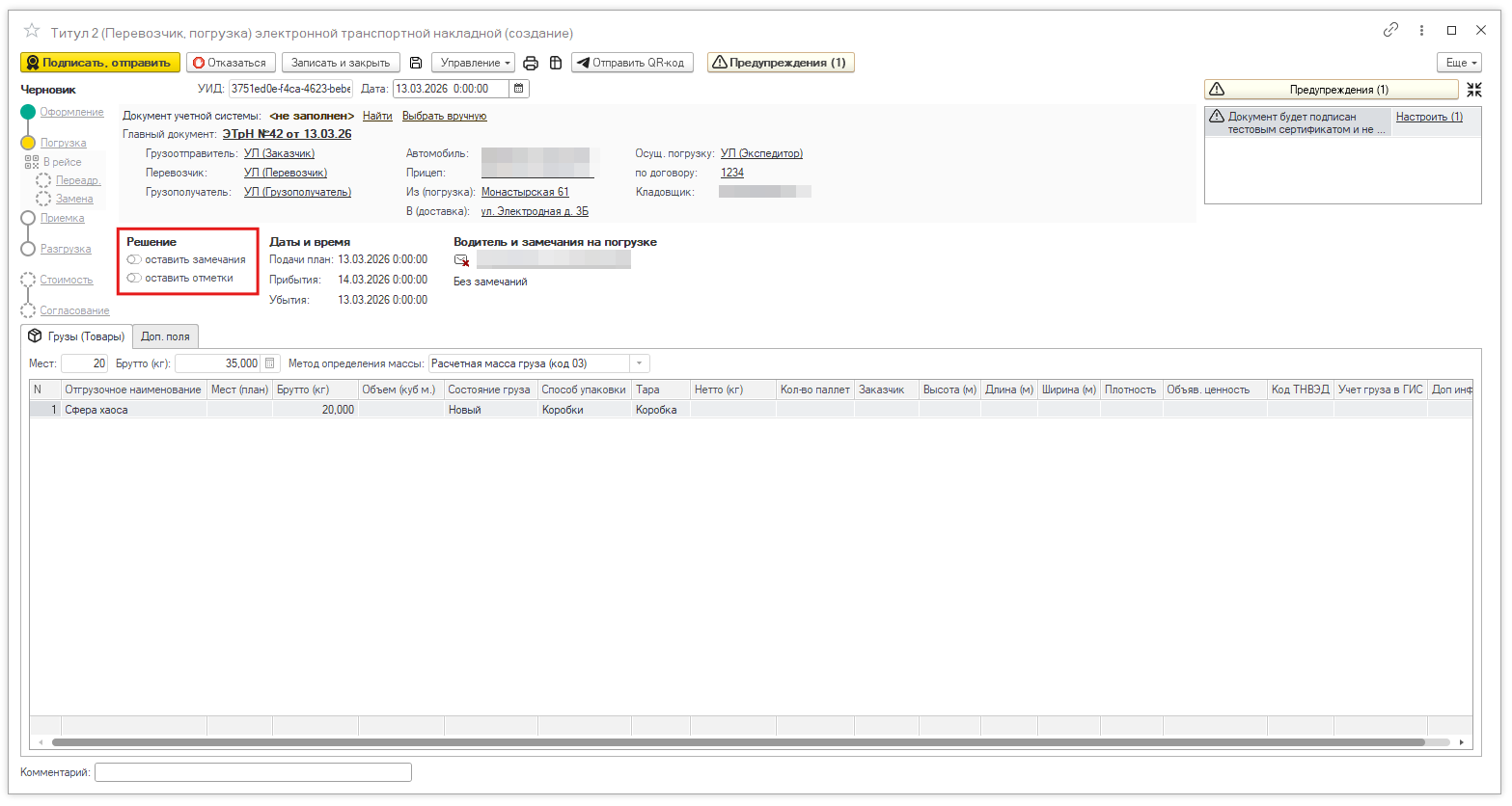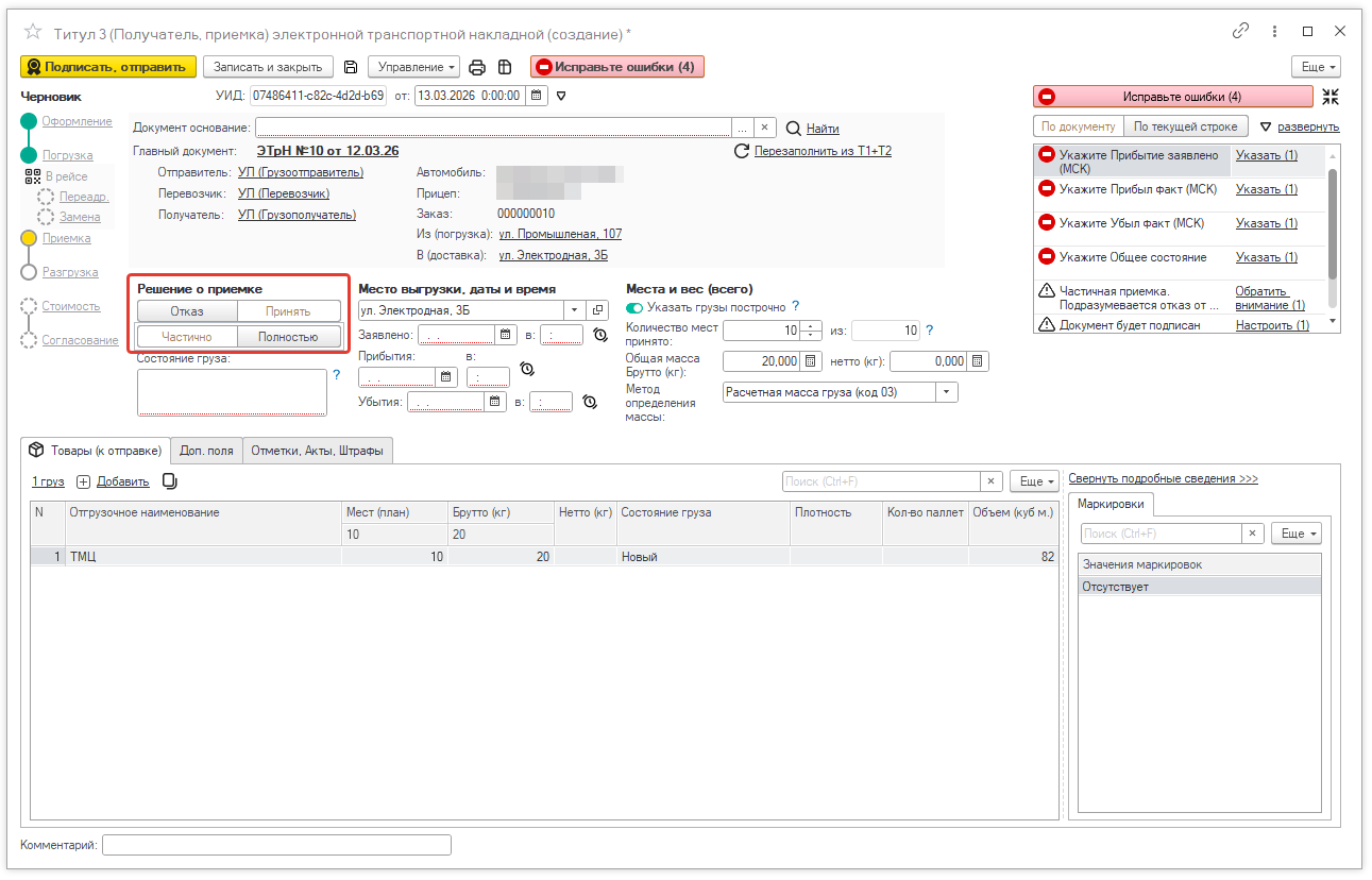 В ЭТрН нужно указать сведения о грузе. Тут поможет справочник учета грузов в Умной Логистике. Отсортируйте список и добавьте нужную номенклатуру или введите ее вручную. Оператор также вручную заполняет информацию о состоянии груза и упаковке. Если какое-то из обязательных полей не заполнить, система покажет уведомление. Нажмите на него и заполните данные. | | | | После проверки документ подписывается и отправляется перевозчику. | | | | Шаг 2. Перевозчик подтверждает погрузку | | | Когда перевозчик принимает груз, он оформляет Титул 2. На этом этапе перевозчик может оставить замечания во вкладках: - «Замечания перевозчика»: например, добавить время прибытия, погрузки или данные о состоянии груза, веса — так вы защитите себя от будущих споров;