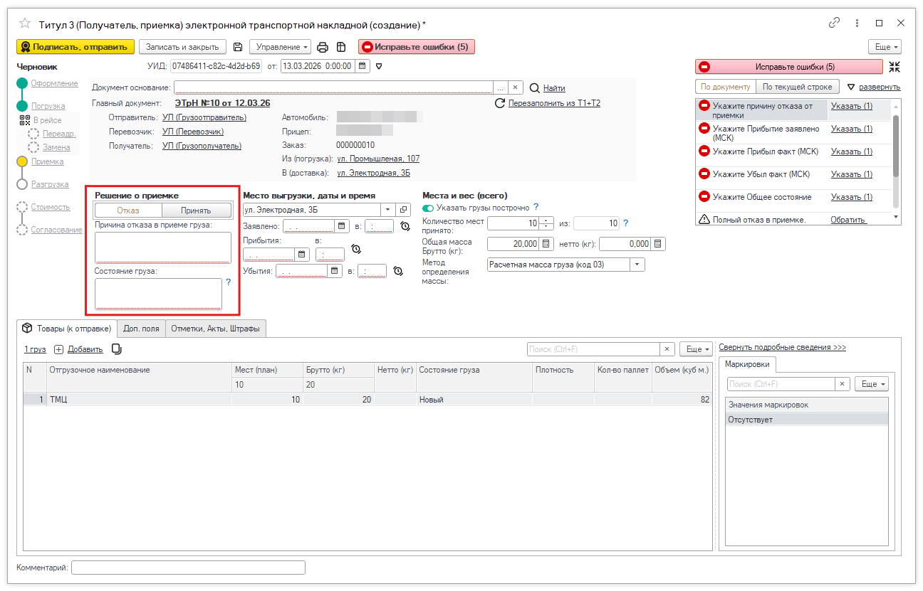 После подписания документ отправляется грузополучателю. | | | | Шаг 3. Грузополучатель принимает груз | | | Грузополучатель получает документ в своей системе и из журнала ЭТрН оформляет Титул 3. Грузополучатель указывает: - место, дату и время фактической выгрузки;