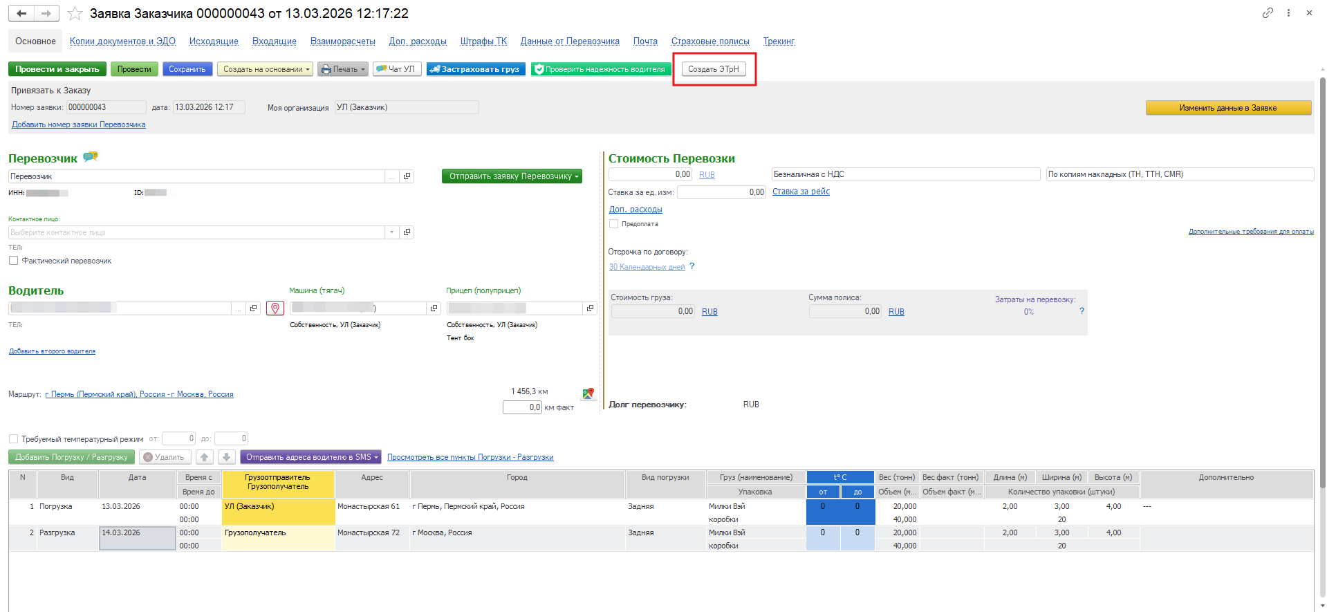 Данные о перевозке автоматически подтягиваются в ЭТрН. Не нужно с нуля вручную вводить данные об участниках обмена, водителе, датах погрузки и разгрузки и самом грузе. Информация переносится из документа основания — заявки на перевозку. При этом ЭТрН можно создавать: - из заявки;