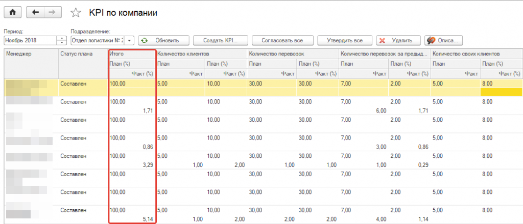 Столбец «Итого» показывает суммарный процент выполнения плана по всем показателям.