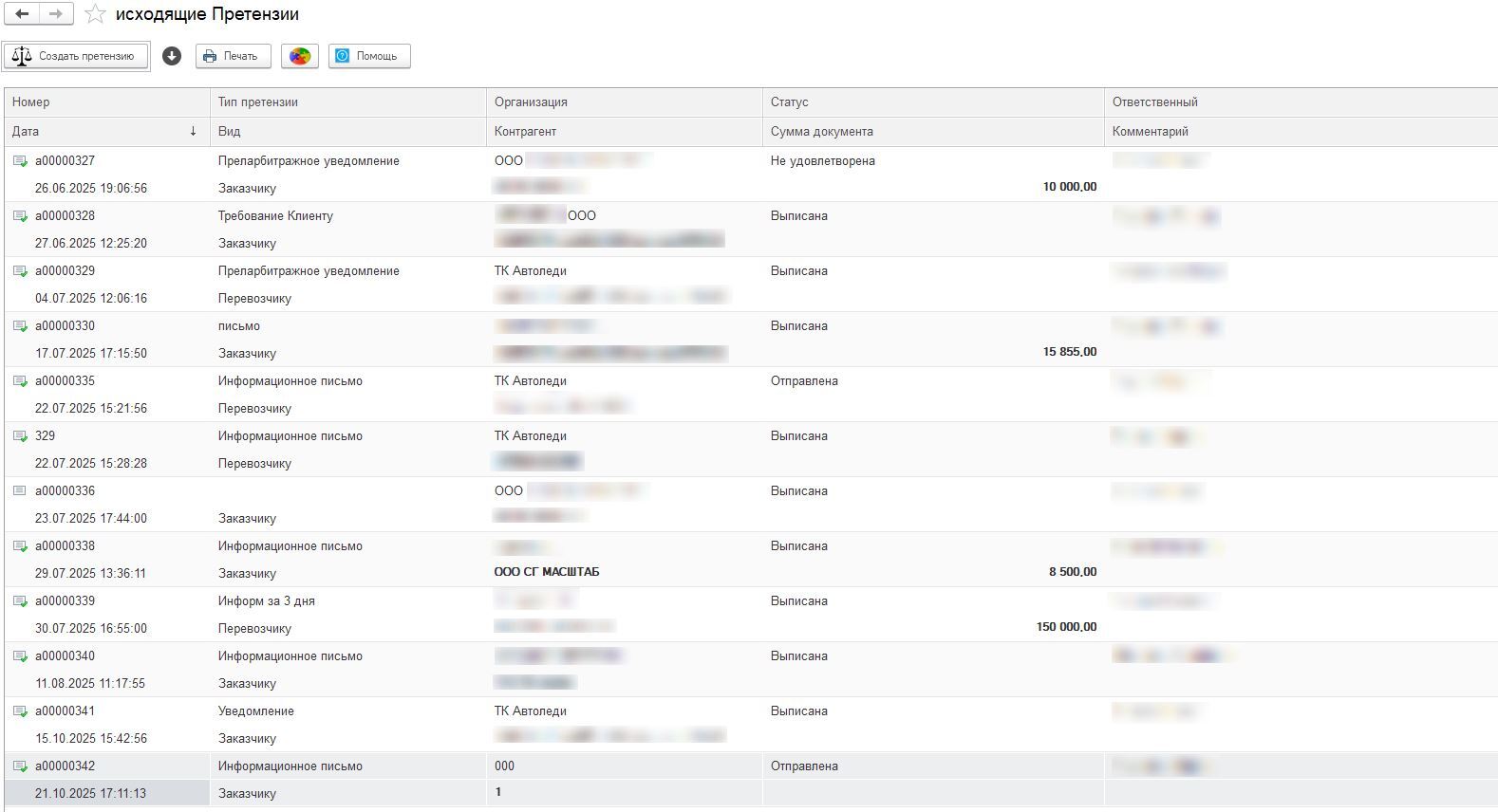 Факт отправки сохраняется, а все претензии и их статусы отображаются в журнале — видно, кому направлен документ и на какую сумму.