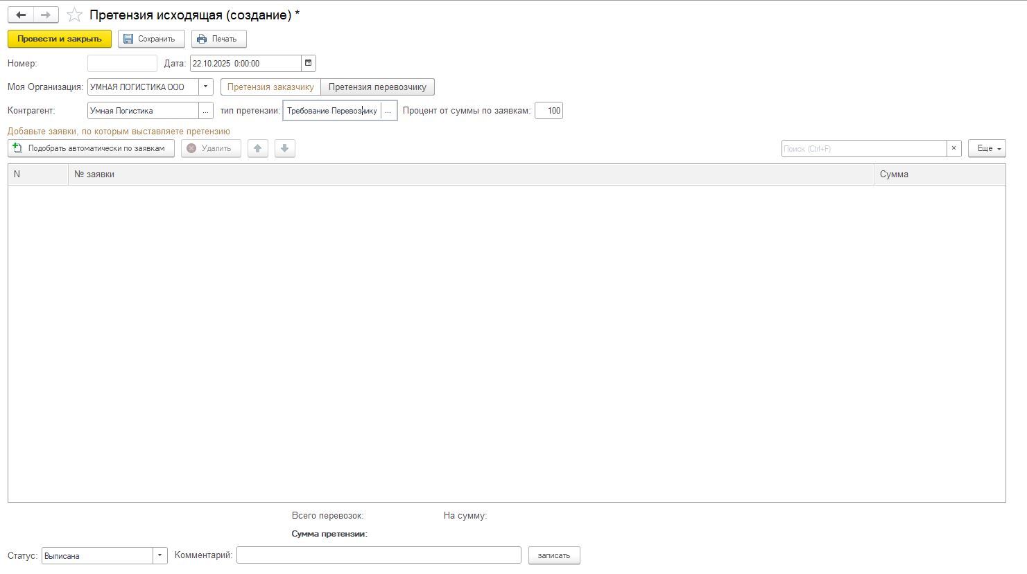 Создать претензию за минуту можно прямо в Умной Логистике. Инструмент «Система выписки претензий» помогает быстро оформить и отправить юридически корректный документ, не обращаясь к специалисту. Все делается в одном окне — от создания до фиксации статуса документа.