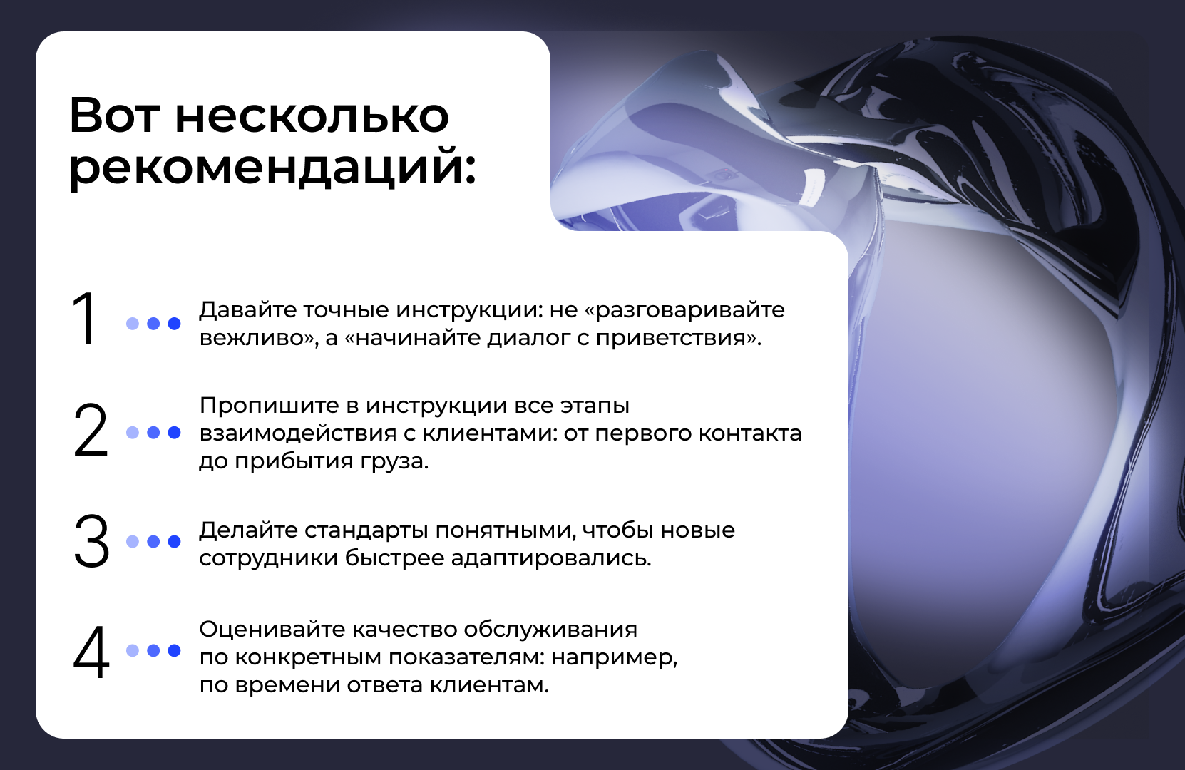 Стандарты нужно соблюдать постоянно — это напрямую влияет на репутацию, прибыль и устойчивость бизнеса. Следите за временем ответа на запросы, сроками доставки, условиями хранения груза и критериями оформления накладных.