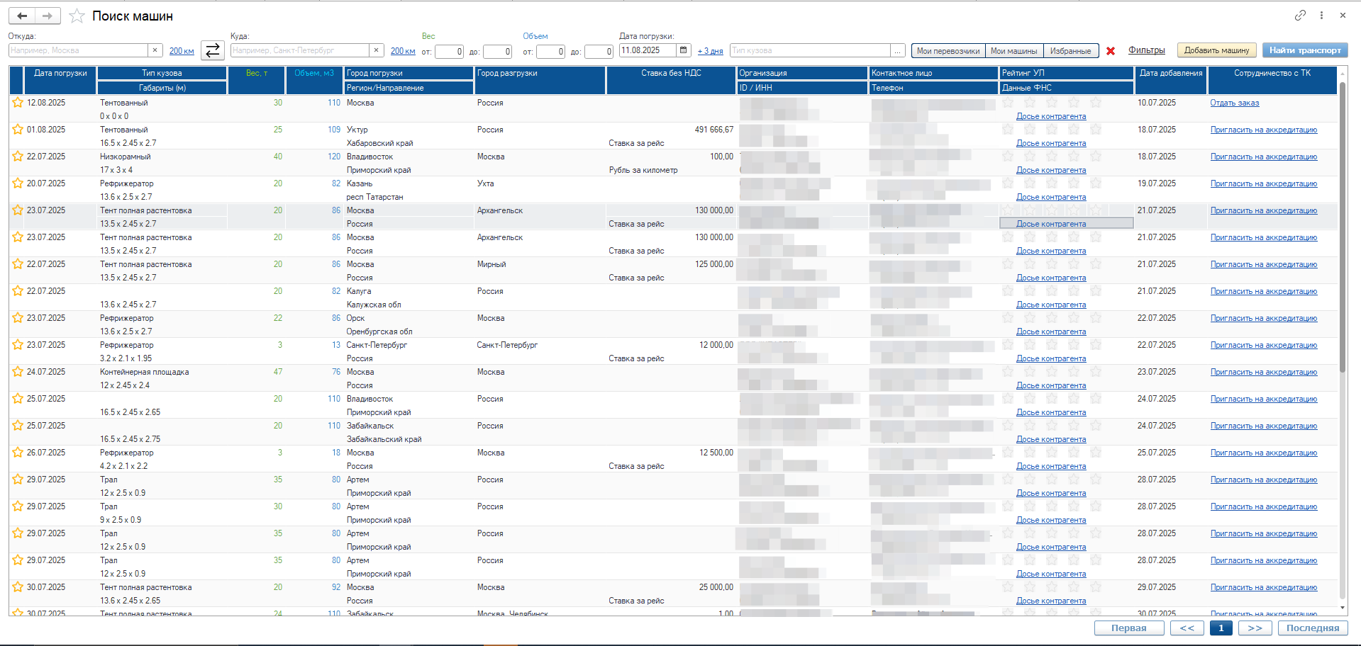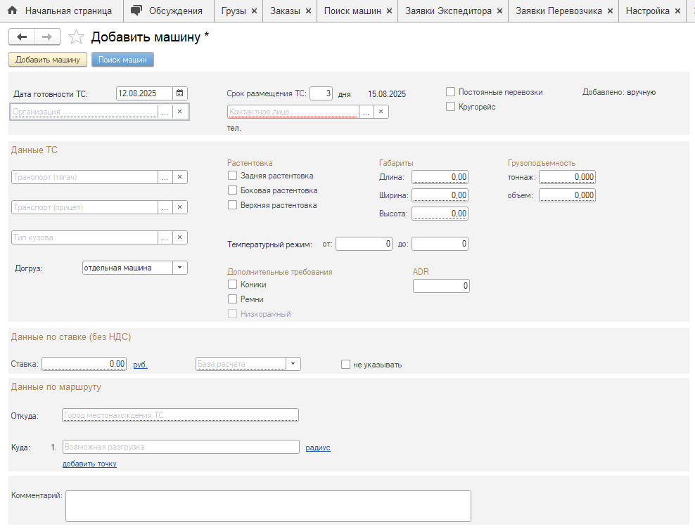 Если установлена специальная настройка, машины попадают в журнал автоматически в зависимости от даты разгрузки в заявке. Иногда перевозчик размещает свободное авто через функцию «Добавить машину». В карточке указывает: