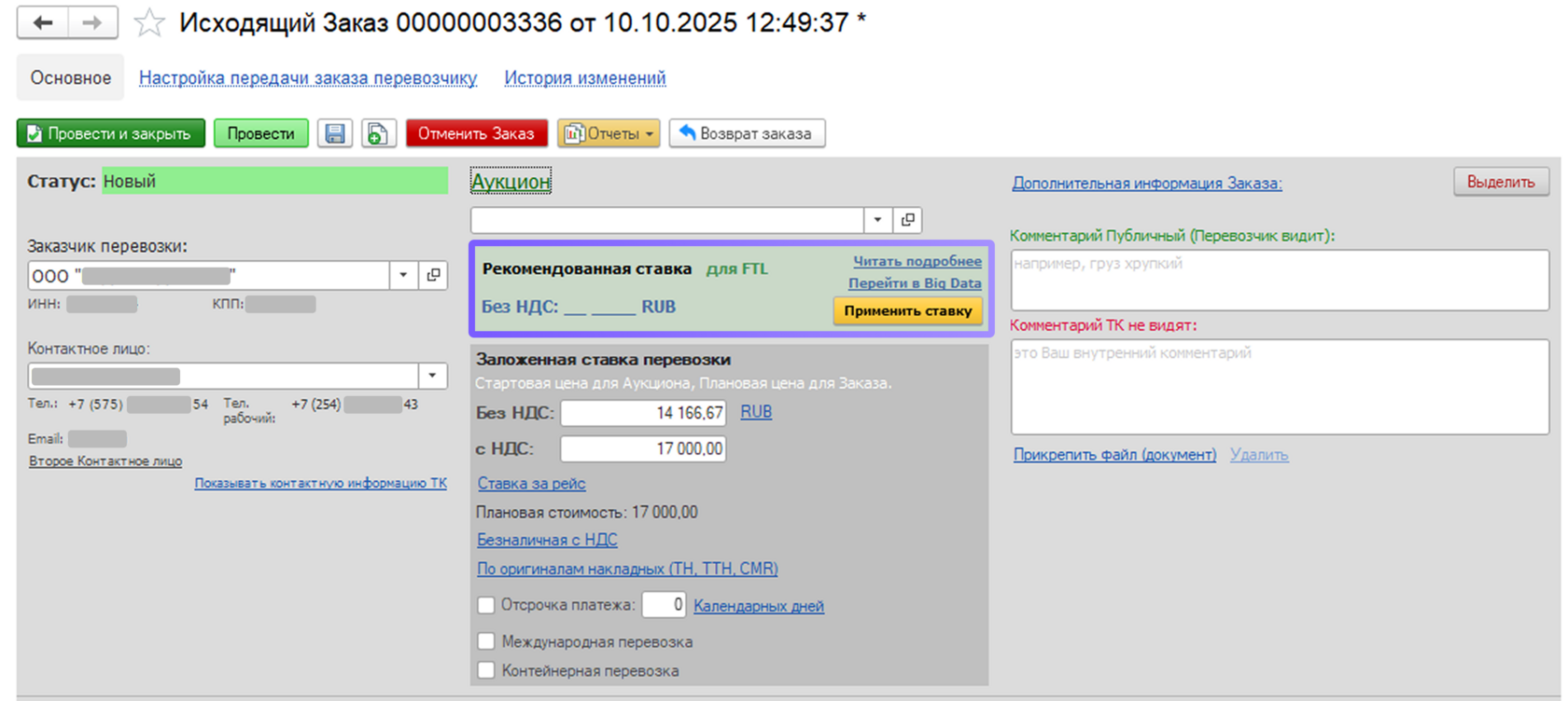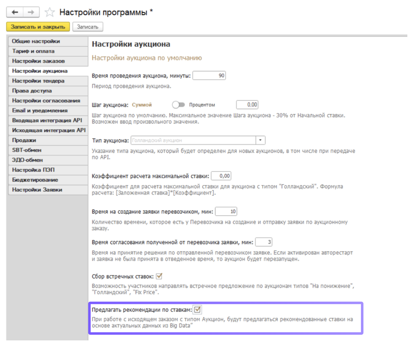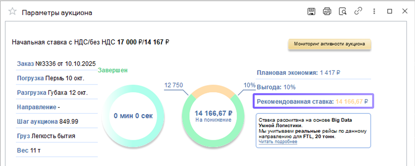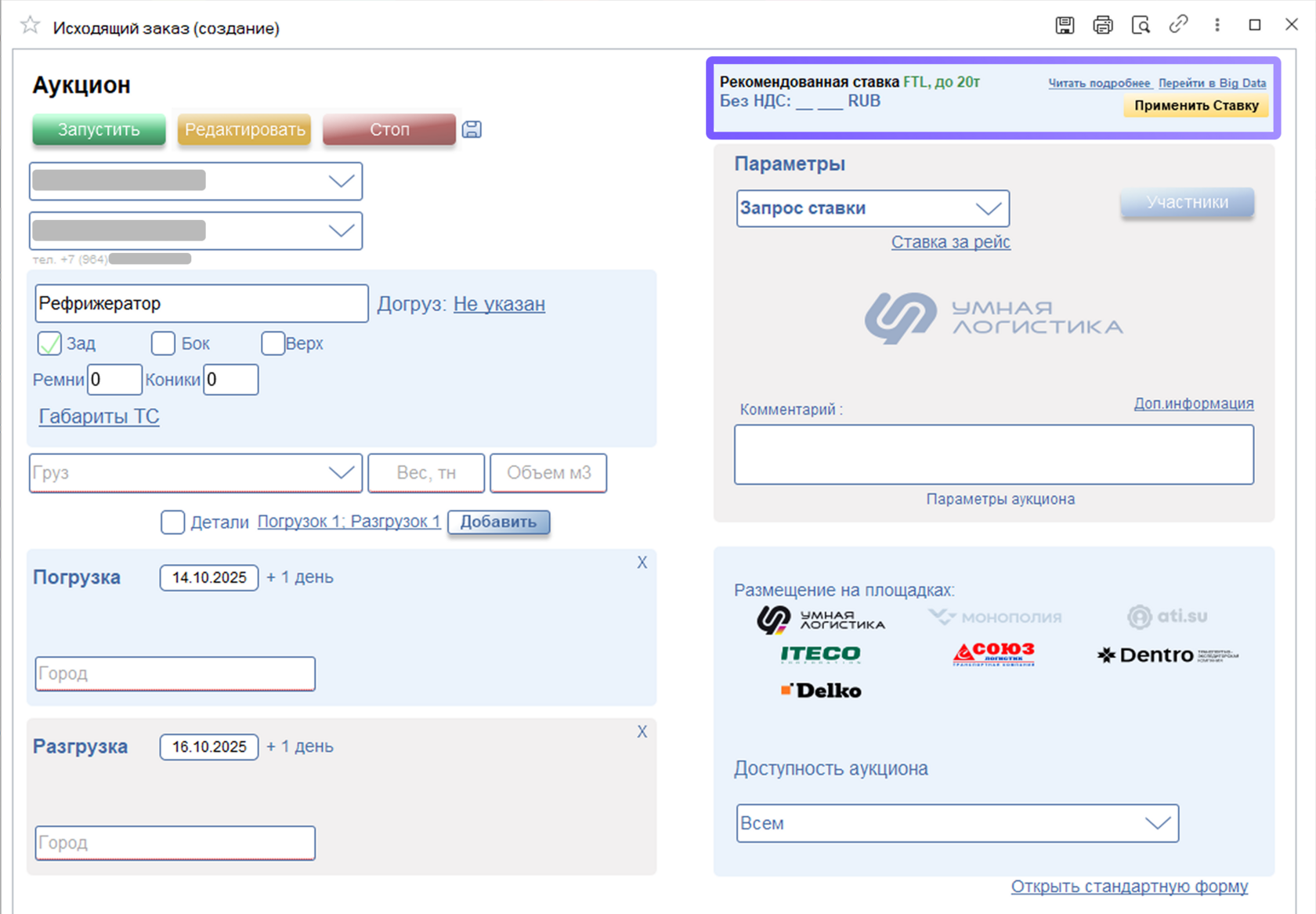 В системе будут отображаться рекомендуемые ставки. Чтобы их включить, поставьте отметку в настройках аукциона. | | | Система рассчитывает рекомендуемую ставку на основе Big Data в Умной Логистике, а это 7+ миллионов реально завершенных рейсов. Рекомендуемая ставка отображается на разных этапах:- при формировании заказа с типом «Аукцион»;
