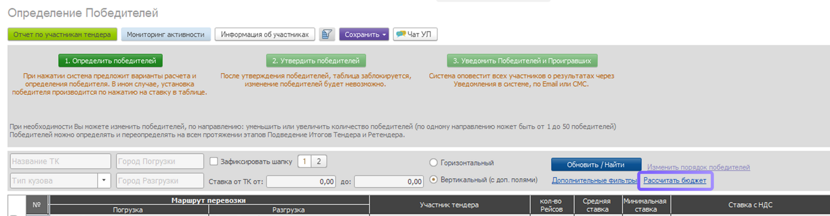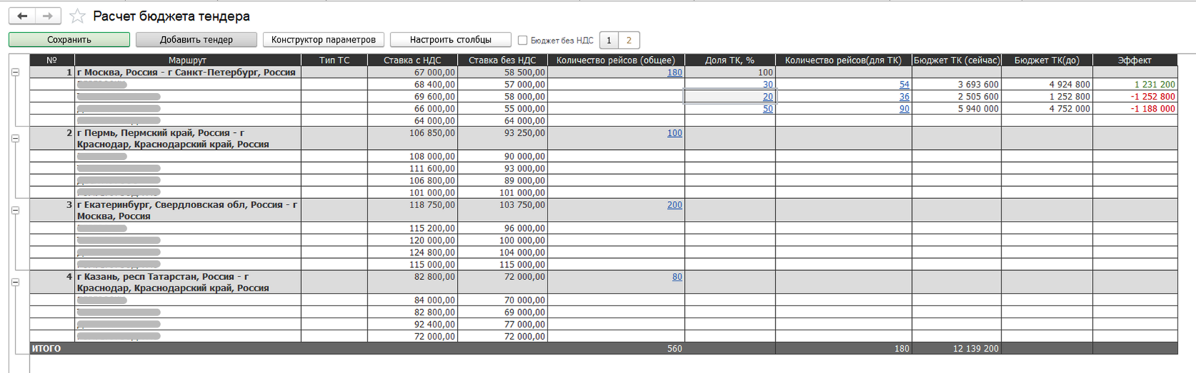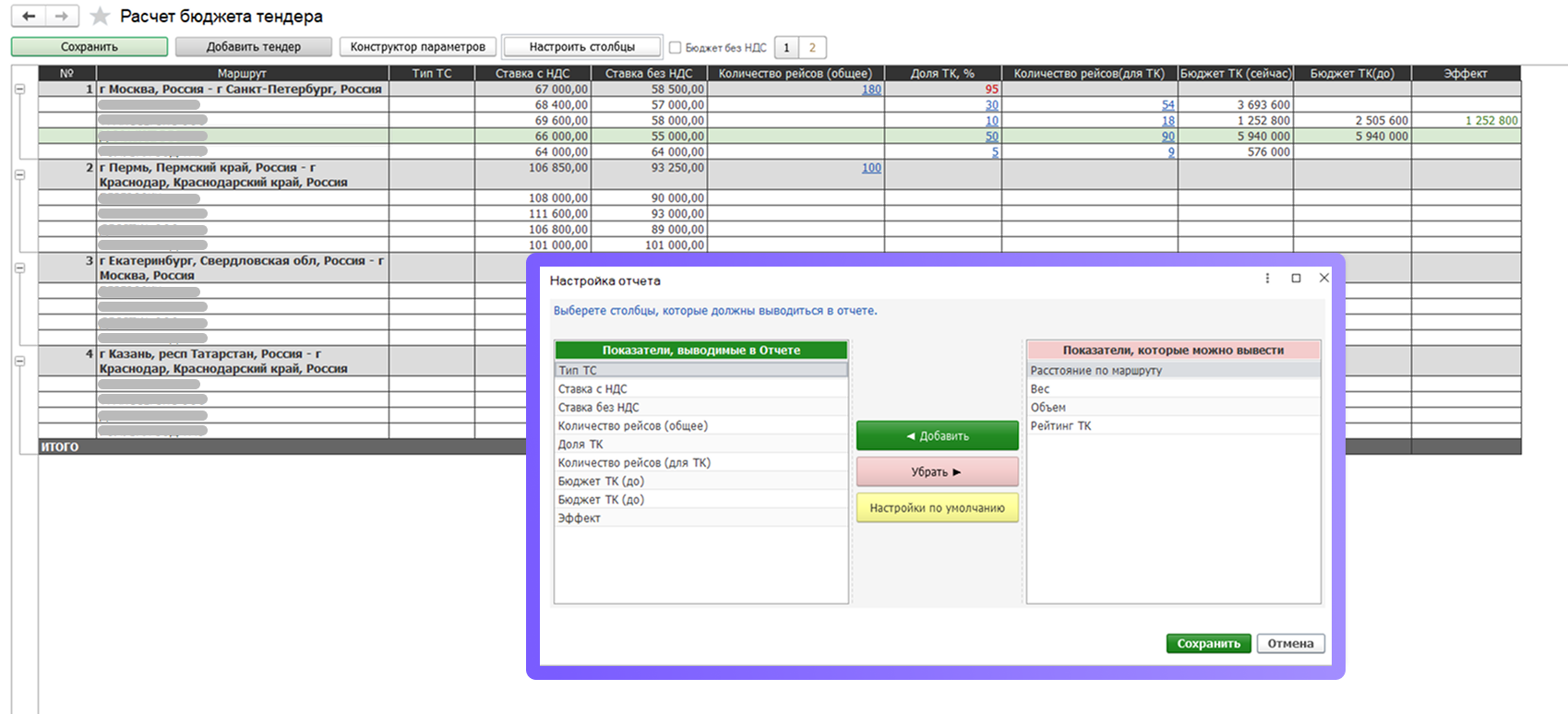 | | | Для расчета бюджета можно выбрать до трех тендеров и посчитать его суммы без учета НДС.И еще два улучшения, чтобы ваша работа с тендерами была еще удобнее:- увеличили количество строк маршрутов в тендерах — теперь их 800;