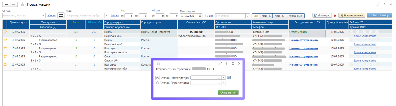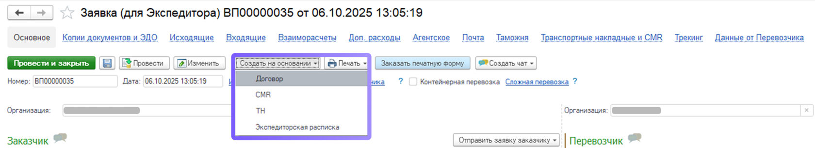 | | | - если же с организацией работали раньше, программа предложит отправить исходящий заказ перевозчику или заявку экспедитору: