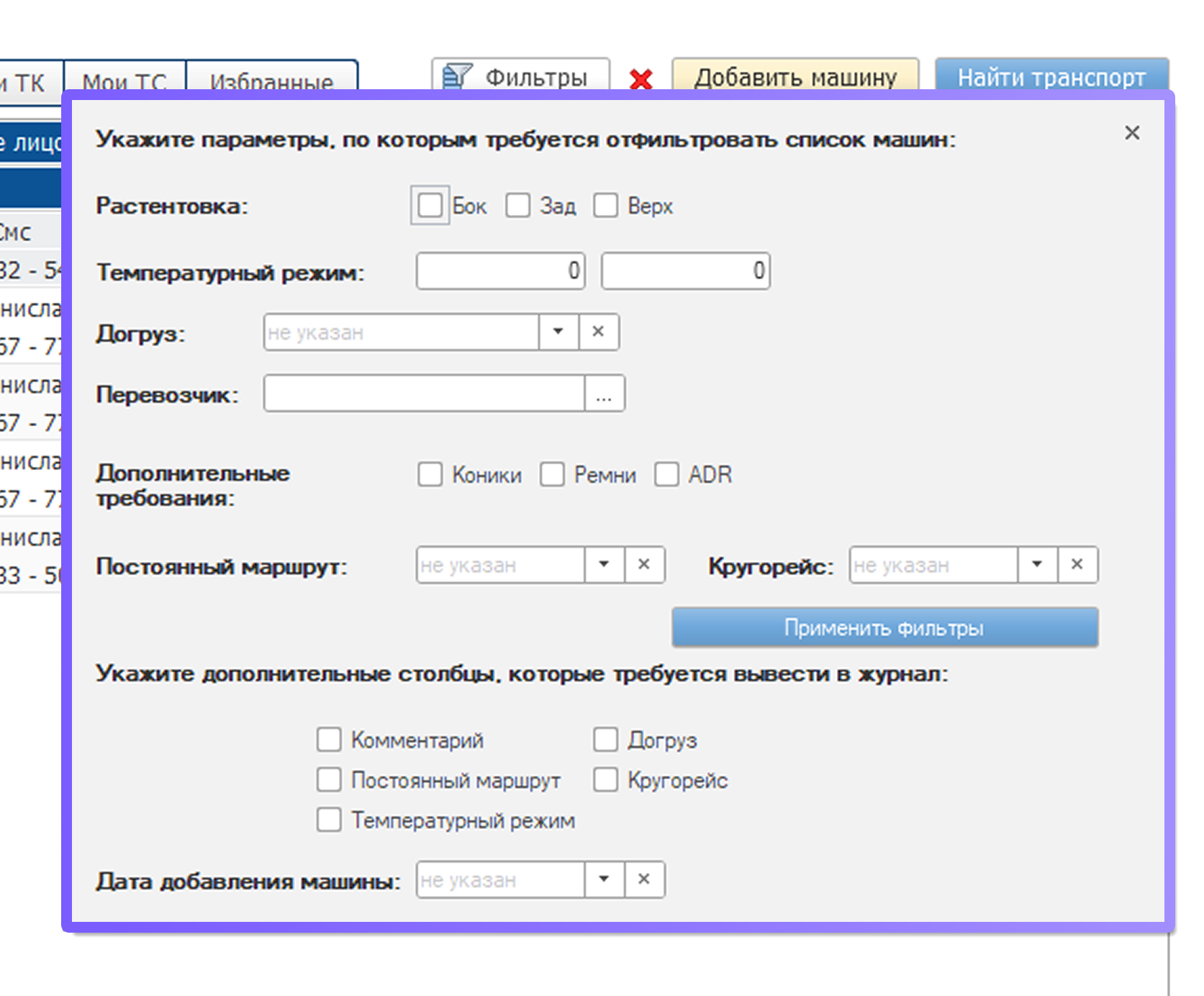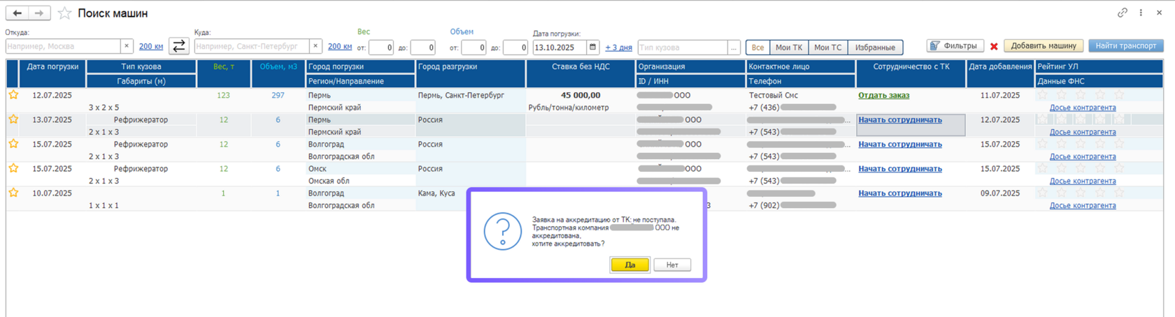 Чтобы заявки формировались полностью и без ошибок, даже если в них нет данных по подразделению или статье затрат. Теперь система сама подставит корректные значения и сохранит целостность бюджетных данных. | | | Продукт: Транс для транспортных компаний, Карго для грузовладельцевЧто сделали?Теперь добавлять машину в журнал можно и в Умной Логистике Карго. Начинайте сотрудничество с ТК в один клик: - если с компанией раньше не сотрудничали, система предложит аккредитовать ее: