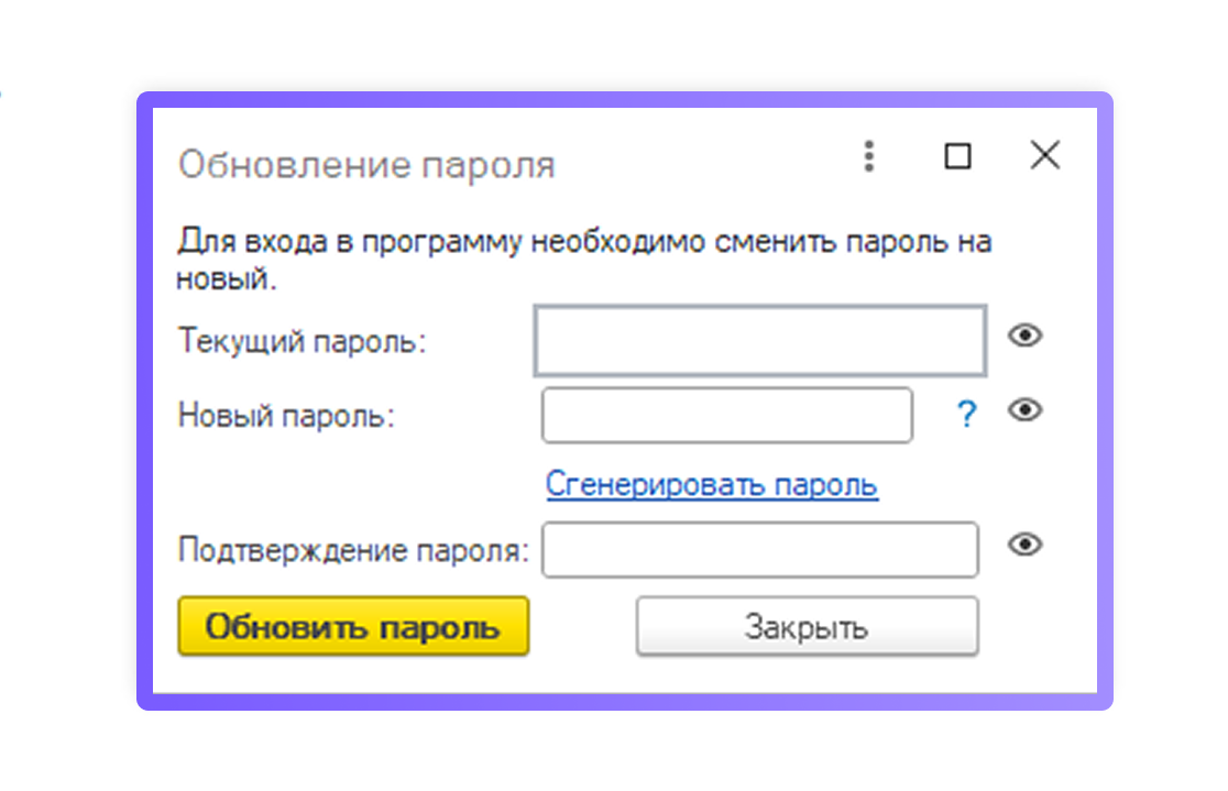 Теперь система сама будет следить за тем, чтобы пароль обновлялся вовремя. Настройте напоминание о смене пароля в разделе «Права доступа» через команду «Смена пароля». Можно выбрать периодичность в 1, 3, 6 месяцев или 1 год. | | | Через установленный срок система напомнит о смене пароля при входе: | | | - Введите действующий пароль в поле «Текущий пароль».