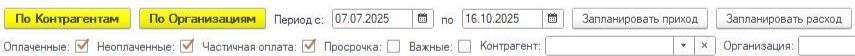Приходы и расходы можно добавлять вручную или автоматически, если у вас тариф «Флагман». Платежи легко сортировать по контрагентам и организациям и через фильтры: