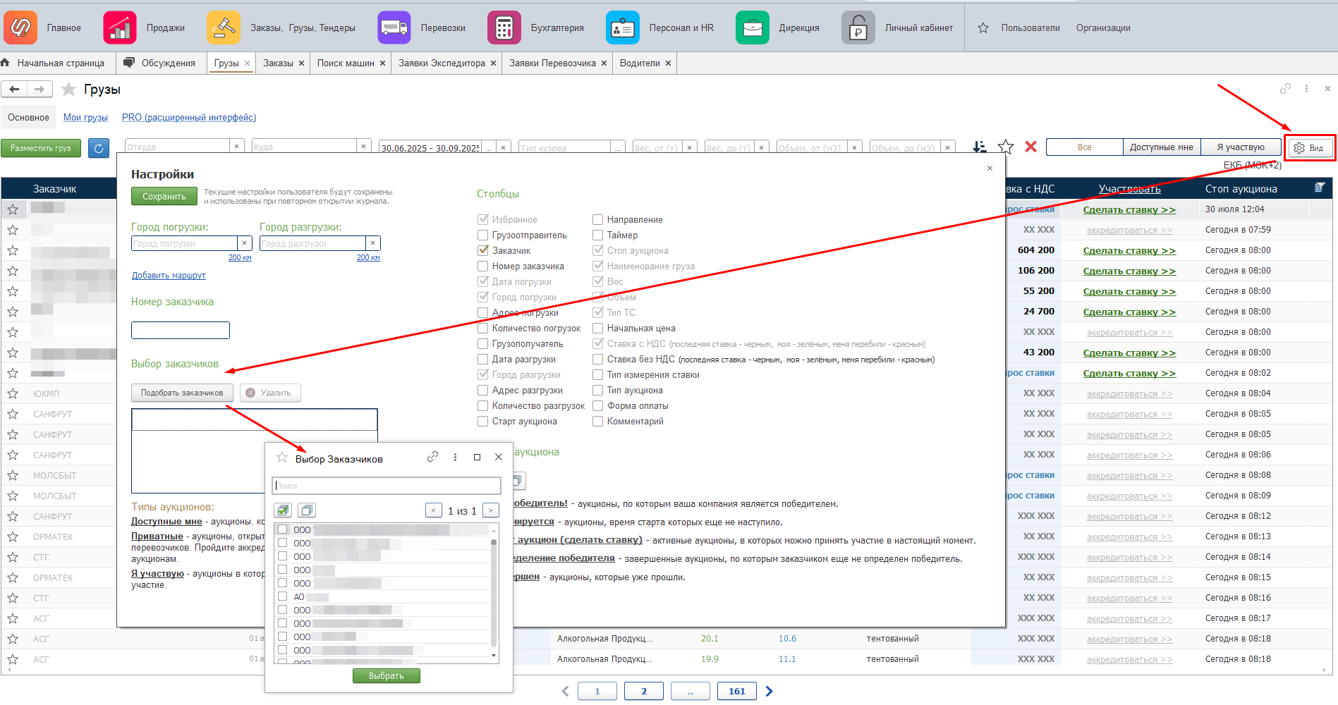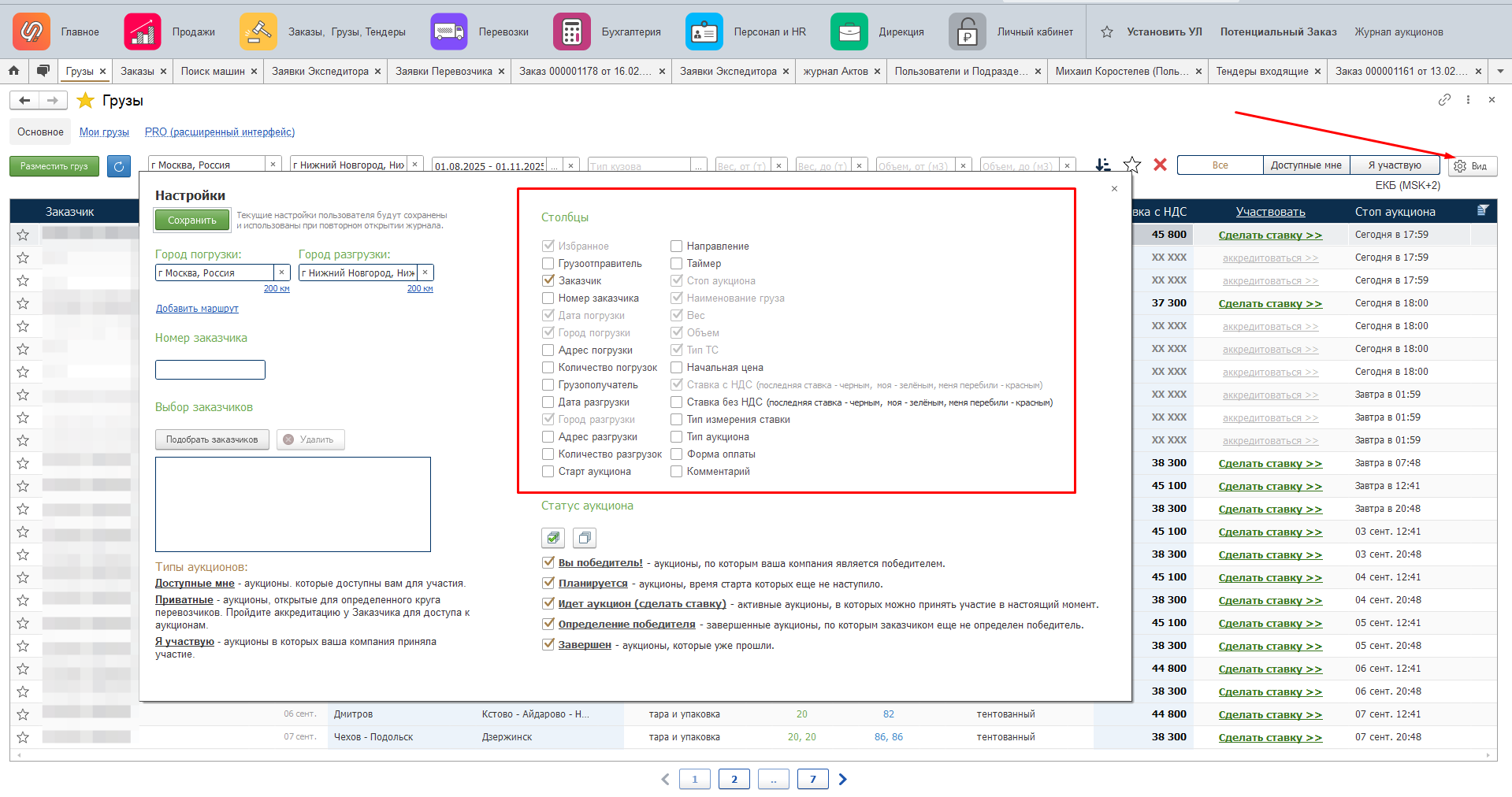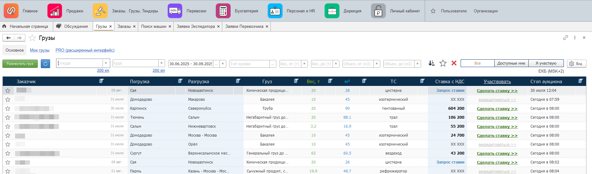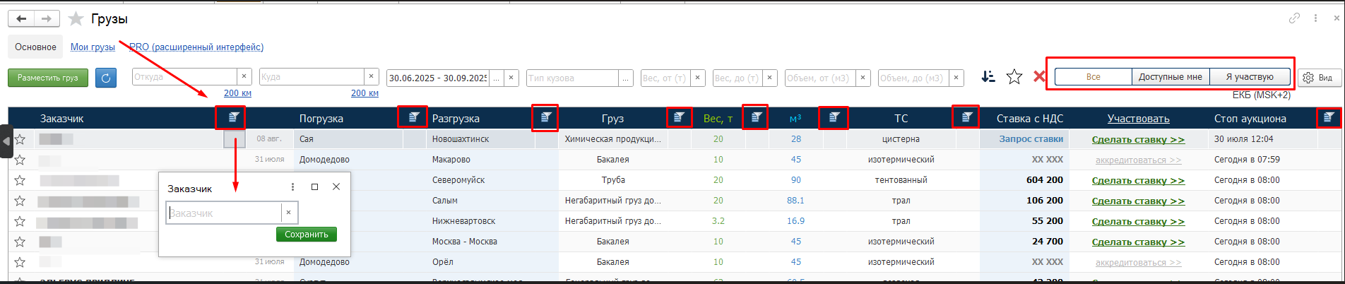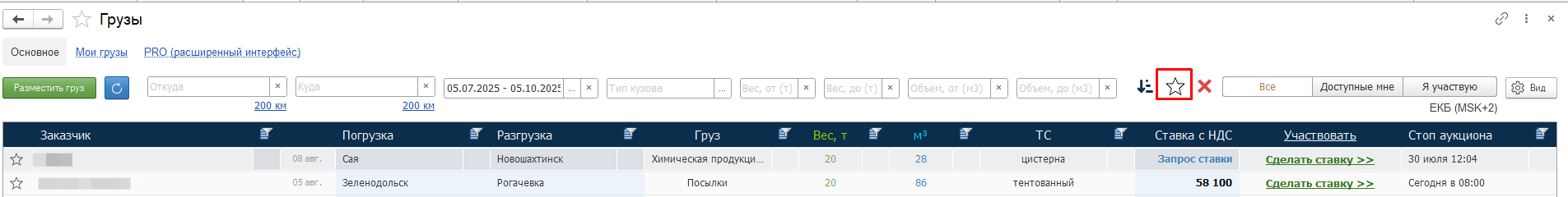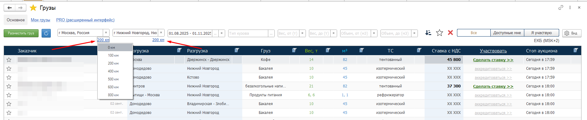 1) Основной — упрощенный вариант, где видна только ключевая информация по торгам. 2) Мои Грузы — исходящие аукционы, которые запускаете вы, чтобы разыграть свой рейс среди перевозчиков. 3) PRO (расширенный интерфейс) — видна не только информация из основного журнала, но и подробно описана специфика необходимого транспорта. | | | | 3. Отфильтруйте список аукционов