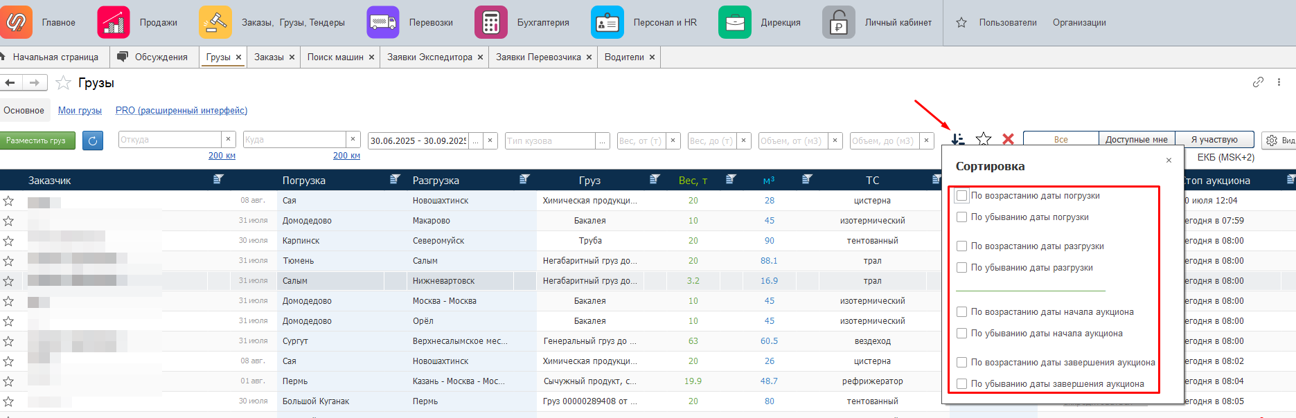 | | | | Кликните на кнопку «Сортировка», чтобы настроить сортировку по возрастанию/убыванию дат погрузки/разгрузки, начала аукциона и остановки аукциона.