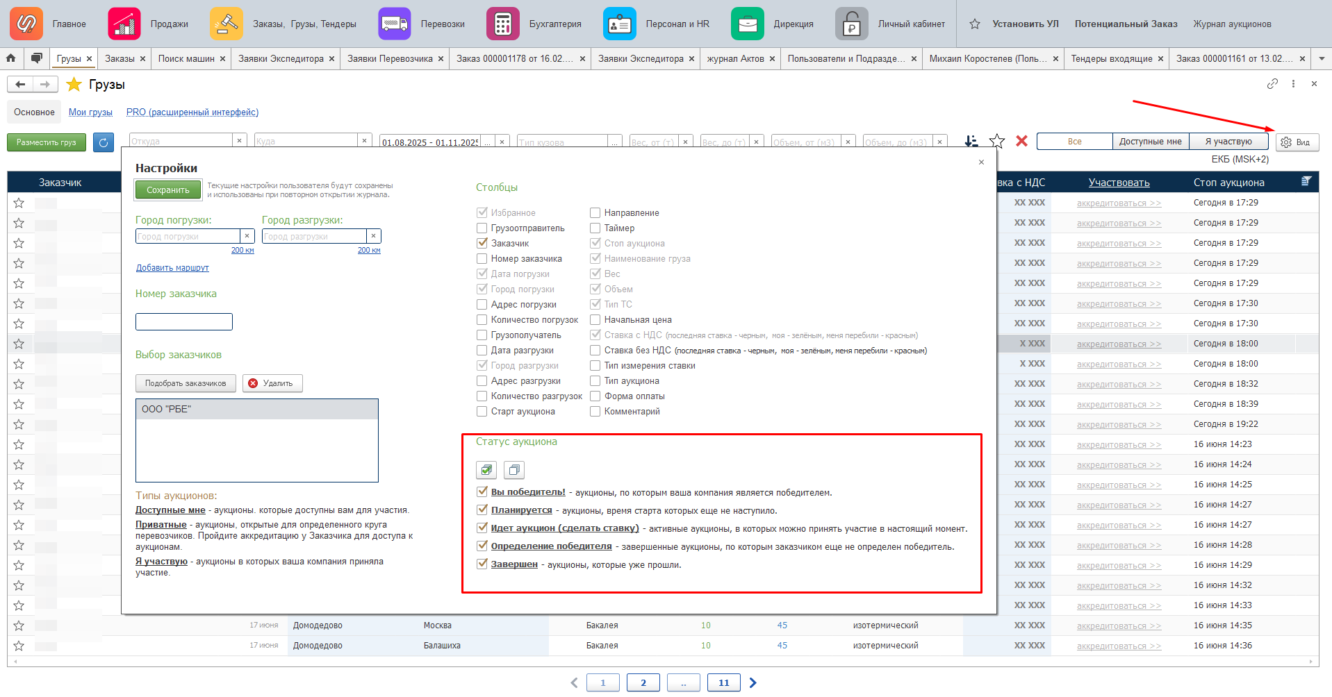1) Все — отображаются все аукционы, которые опубликованы в Умной Логистике. 2) Доступные мне — отображаются аукционы от контрагентов, у которых ваша компания прошла аккредитацию или она необязательна. 3) Я участвую — аукционы, в которых участвует ваша компания.