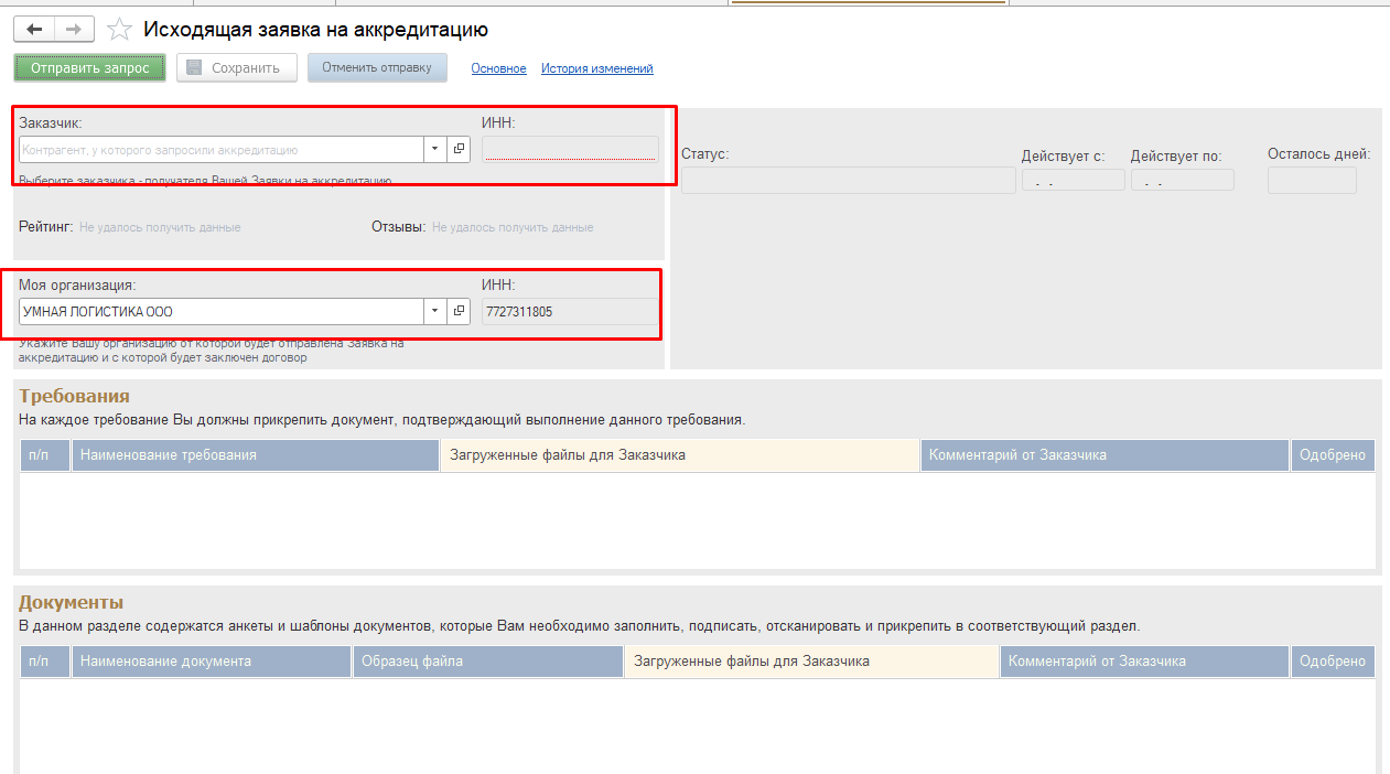 Создавайте заявки на аккредитацию для конкретных контрагентов — система подскажет, какие документы нужно прикрепить